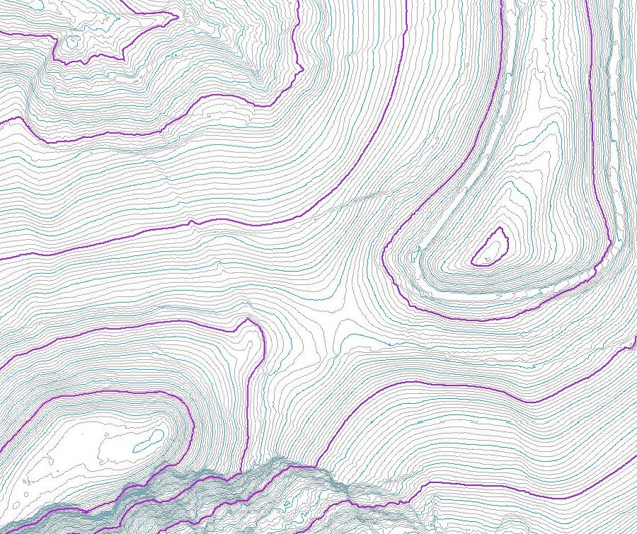 The image below is a Lidar contour map of part of NT Golden Cap estate west of Bridport. 1m contours are in grey, 5m in blue and 25m in purple. The map is approximately 800m wide. It illustrates the elevation detail that can be extracted from Lidar. If you compare it with an OS Explorer map of the same area, you'll notice how much fine detail is lost due to the generalisation necessary to make a legible 25k map. Orienteering maps are usually 1:10k or 1:15k so need to be based on the sort of high quality landform information Lidar can provide.
