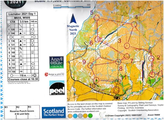 So, first day’s event on a lovely hillside at Ardchattan. It must be one of the best drives to an O event that we have taken with good weather and views of the starts. 50m uphill from the car park for the older classes. My course on M65S was 3.5km with 145m climb and my main worry before the starts was that I had not had enough recent Orienteering events to practice all the technical details,bearings, pacing and most important for me slowing down at times to check the map.Also using all the features that Scottish orienteering has that we don’t have in the South West, rocks, cliffs, distinctive hills, contours, marshes and so many more re-entrants.