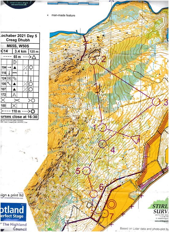 A later start which was unfortunate as it was only 10mins down the road from us. 2.3km and 30m climb,I thought it must be tough as so short. We made our way to an area overlooking the finish where everybody was walking around barefooted on the golf fairway and sitting in groups cheering on the finishers. The sun was shining, people were happy and saying this is the orienteering we all love, except for one or two of the longer course competitors coming back saying the forest was very hard and unforgiving. So, when I picked up my map and looked at the route for no. 1 either up a hill, through ferns, cross a stream over a marsh and hope to hit a spur or go round the fairways.A longer route but much safer to start with. I chose the fairways and as this worked well adopted this strategy for the rest of the course. Only one 20second error on the whole course, I won 6 out of the 10 legs and won my class in 20mins.30 seconds with 2nd coming in over 2mins.30secs later than me and I had walked some of the course. I was especially pleased with my run in as I knew I was doing well so pushed extra hard and ran the 110m from last control in 25 seconds. Thanks in part to SIAC 10 seconds faster than Jo and Annie.There’s life in the old man yet!A long way to go for a 20min run around a golf course, not a usual Scottish 6 day event unless you had controls in the rough or up the hill and then it was a very different story.