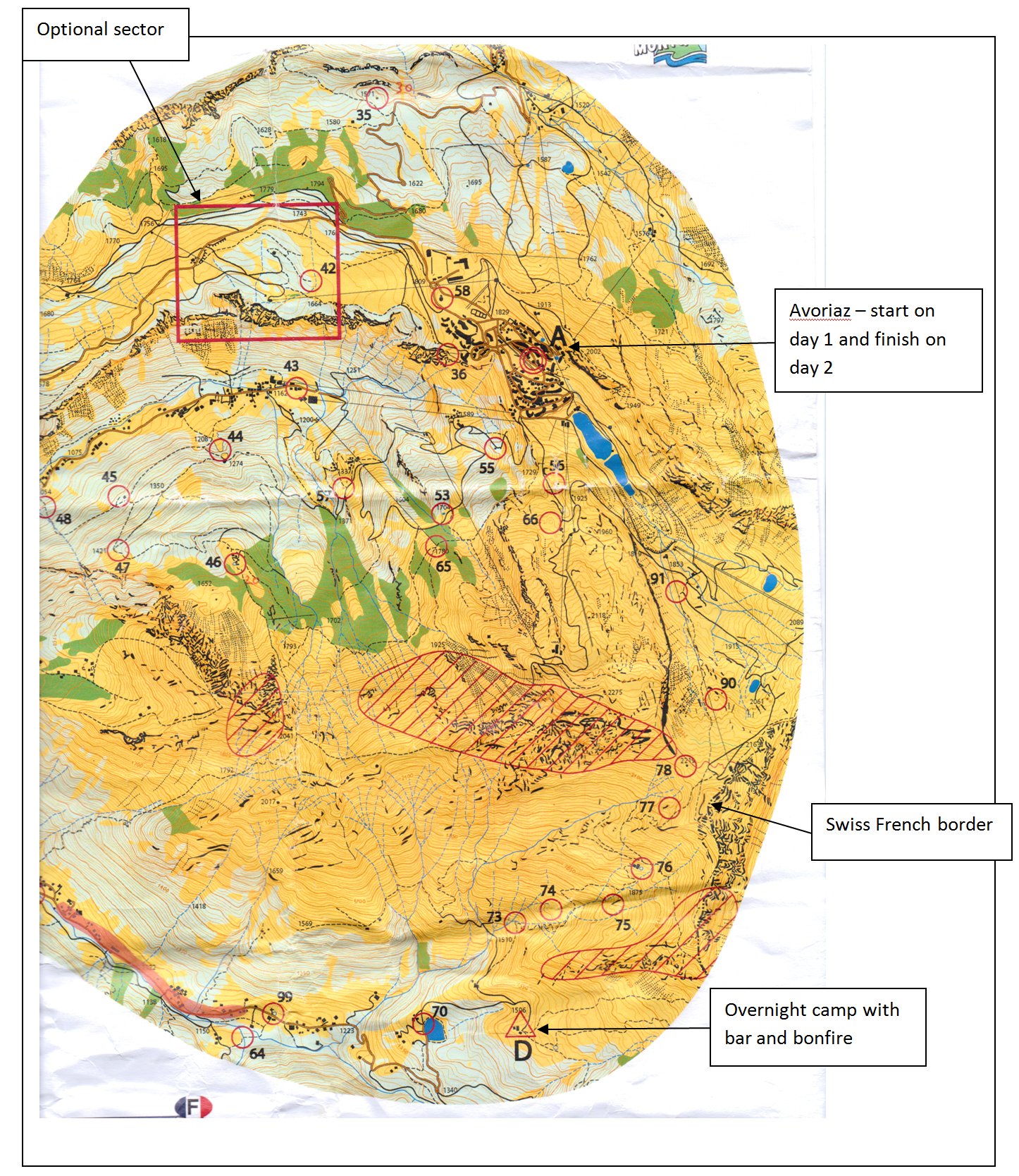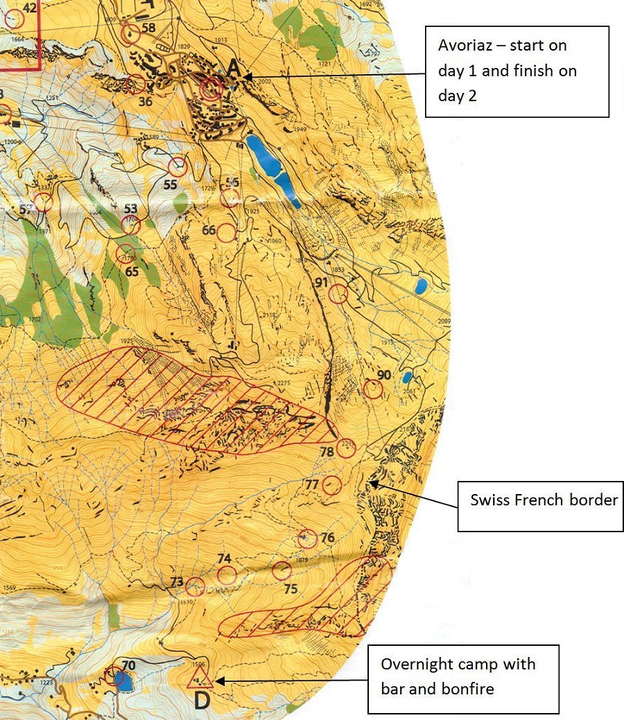 Having done the UK OMM we understood the format of the event and were able to put together 2 rucksacks full of kit. There was some discussion over what we might need, our experience of the UK OMM held in October led us to pack warm sleeping bags, down jackets, hats, gloves, over-trousers etc. However the French OMM was being held in July so probably wouldn’t be too cold, in fact, it could be really warm, so out came the down jackets, gloves and woolly hats and in went sun hats and sun cream. Further discussion followed - Avoriaz is at 1800m and the weather could be misty, rainy, even snowy.... back in with the gloves and warm hats, hey-ho!