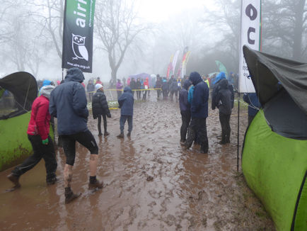 However this wasn’t the end of the story because the assembly area began to look like a WW1 battlefield. Along with many others, the WIM tent had been left up overnight, but had collapsed under the weight of snow breaking some poles. Yesterday's run in looked like a disaster area and it took about 45mins to sort out the wrecked tent before it was bodily dragged down to a new location which was initially nice green grass adjacent to the Relay Run in, but rapidly degenerated into a brown quagmire! The mud became spectacular, a liquid brown slurry that it was impossible to avoid, not to mention the run in which had a 180 deg corner half way along it with predictable consequences. Photographs really don’t do justice to the scene but the intrepid WIMs who took part have experiences to tell of sliding down hills before struggling back up to the finish which was on top of the hill.
