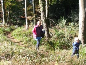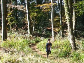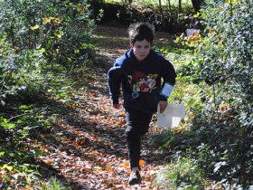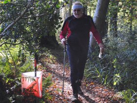The wood comprises a variety of conifer and broadleaf trees with some rhododendron growth in central parts. The pearl is a beautiful area of fast, runnable beech wood in the southeast. All courses visited this little gem and Orange and Light Green had six legs crossing it. It also caused our only worry as when Mary and I set out the stakes we saw autumn leaves had obscured several paths on Yellow and Orange. Feeble attempts to recreate the paths failed miserably but no-one got seriously lost! Orange runners also seemed to like the big earthwalls and banks used here as occasional handrails. Because it’s a small wood Green runners had to loop twice around the far north but there were no grumbles; indeed, the long legs were much appreciated.