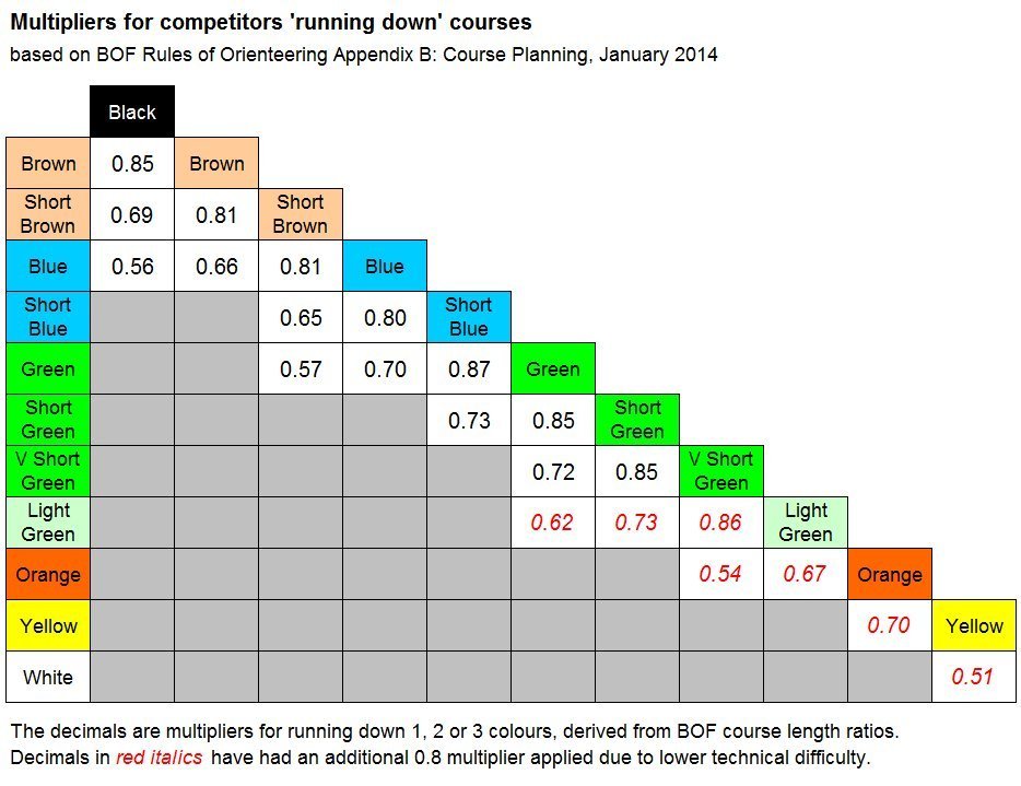 The reductions in calculated points for competitors choosing to run down are given in the table below. The most a competitor running down can score is the relevant multiplier x 100. For example, a Blue competitor opting instead for Green could score a maximum of 0.70 x 100 = 70 points.
