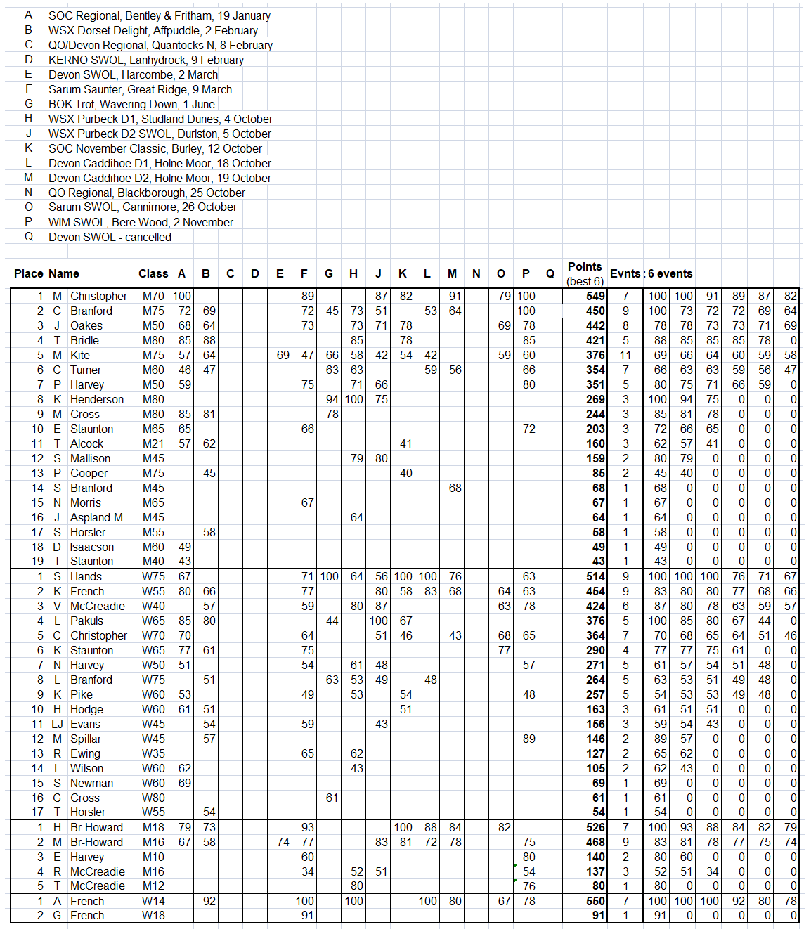 The League table is compiled from competitors' best scores in classic colour-coded 'forest' events organised by WIM and neighbouring clubs. See Rules.