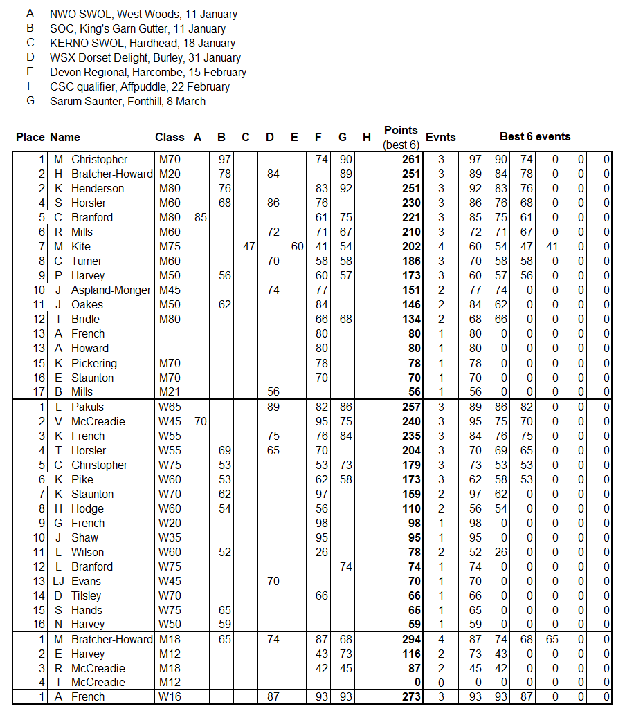 The League table is compiled from competitors' best scores in classic colour-coded 'forest' events organised by WIM and neighbouring clubs. See Rules.