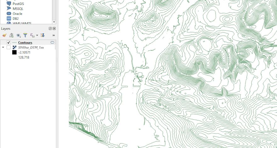 In the Layers panel on the left, you can use the checkboxes to toggle the original layer or the contours on or off. If you want contours in a different colour, right-click on the word ‘Contours’ and select Properties.